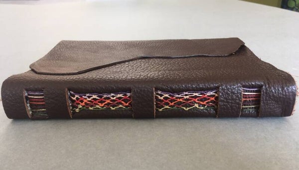 De katernen worden op een klassieke manier genaaid tot een boekblok. Vervolgens wordt het boekblok aan de kaft geregen met kleurrijke draden. Naar eigen keuze kunnen de draden vervlochten worden.